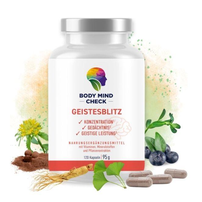 GEISTESBLITZ; faydalı vitamin ve mineralleri, ginkgo, ginseng, bacopa, yaban mersini ve kakao gibi bitkisel bileşenlerle uyumlu bir formülde bir araya getirir. Pantotenik asit ve çinko içeren bu sofistike karışım; B2, B12, nikotinamid (B3) ve piridoksin (B6) gibi seçili vitaminlerle desteklenmiştir. Ürün tasarımı, günlük rutine pratik şekilde dahil edilebilecek bir içerik anlayışı taşır.